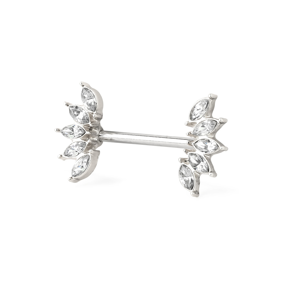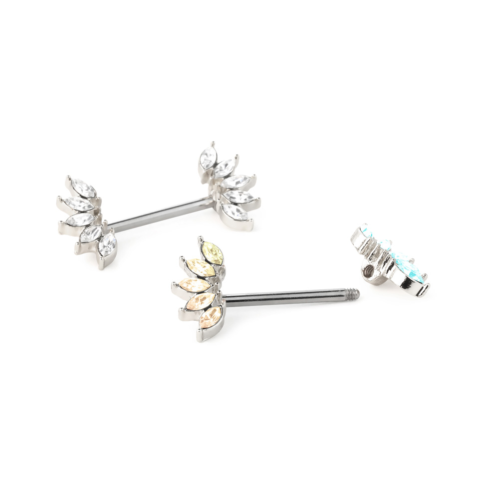 De staaf van dit juweel bestaat uit chirurgisch staal en het ontwerpt bestaat uit messing. Het messing werd gecoat met rhodium, waardoor het metaal zijn glanzende kleur krijgt. De stenen zijn in meerdere keuren verkrijgbaar, waauit je vrij kan kiezen.
