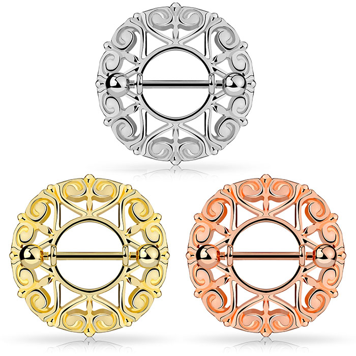 Het is bijna als of je een kroon op je tepel zet wanneer je je tepelpiercing verwent met dit prachtige tepelschild. Dit sieraad is mooi en symmetrisch, met een elegant ontwerp met vele wonderlijke motieven die door elkaar heen lopen.