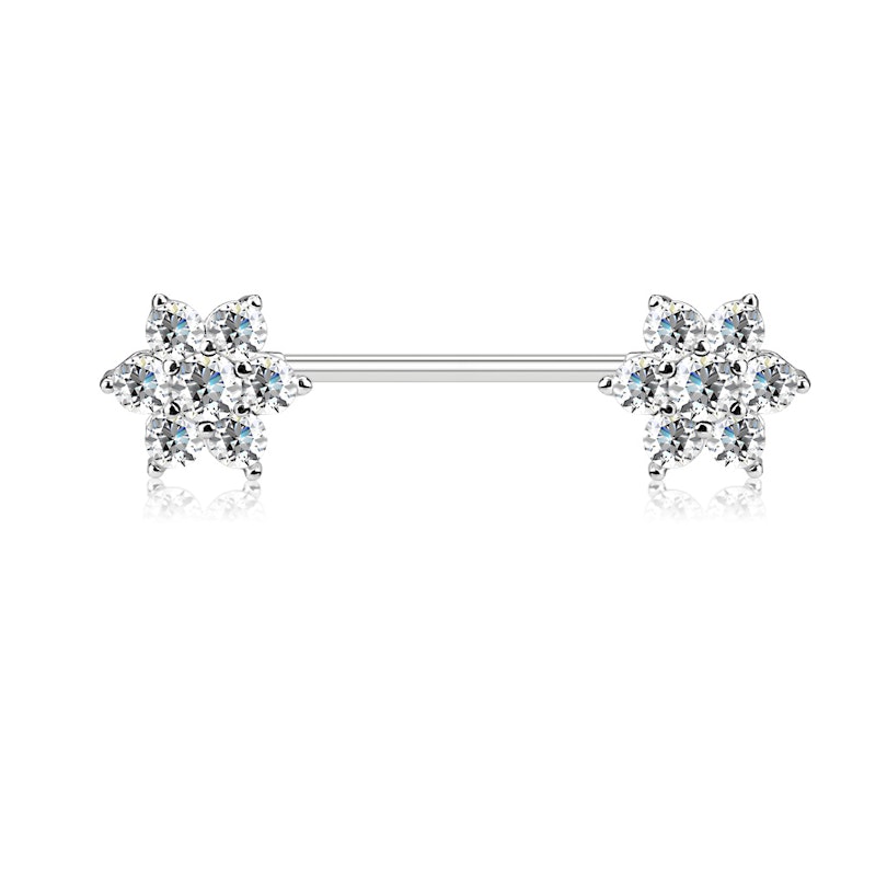 Super fijne en elegante tepelpiercing met de mooist glimmende bloemen aan beide kanten van het staafje.