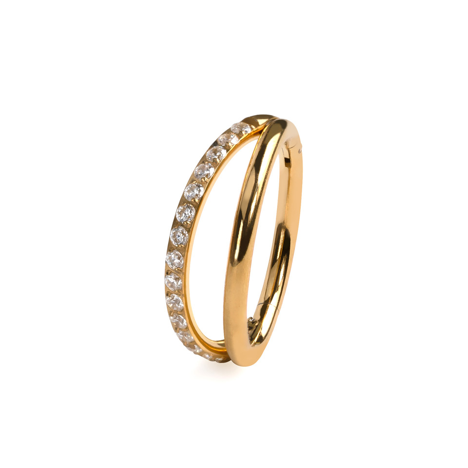Deze titanium ring van Bodymod Trend blijft fresh met een gespleten ring ontwerp, een helft glad en minimalistisch, en een met steentjes gezet. Twee vibes, een ring.