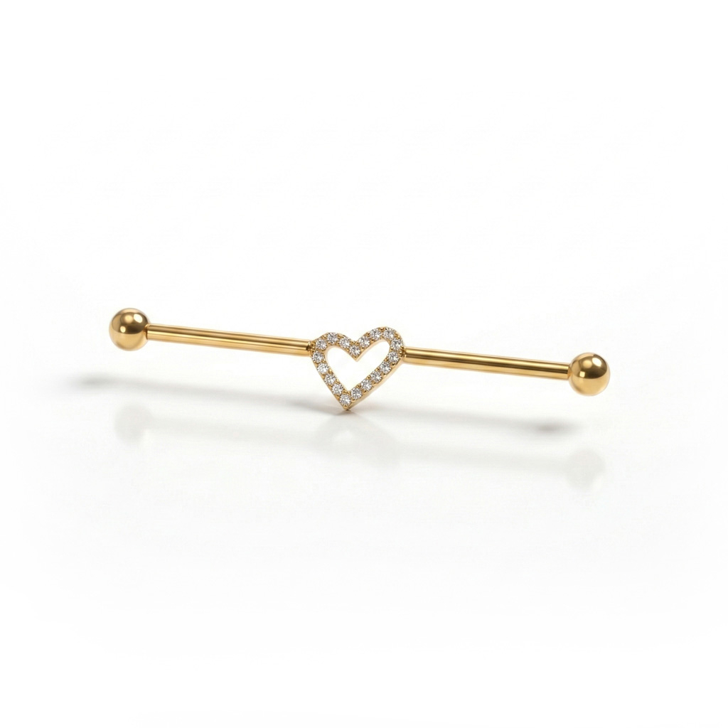 De industrial barbell met een centraal hartje van titanium geeft een zachtere uitstraling aan een klassieke industrial-vorm. Het hartje zit precies in het midden, omlijnd met kleine steentjes in een nette tandzetting, waardoor er detail is zonder dat het zwaar oogt. Verkrijgbaar in goud- en zilverkleurig: de focus blijft op het midden, terwijl de barbell strak en in balans blijft.