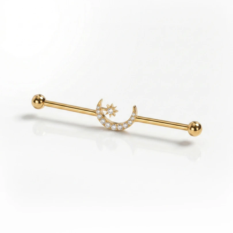 De industrial barbell van titanium met centrale maan en ster zet een duidelijk accent in je industrial piercing. Een halve maan zit precies in het midden en is afgewerkt met kleine steentjes, terwijl een piepkleine ster ernaast ligt en contrast toevoegt zonder het design te overladen. Het ontwerp houdt de barbell strak, met details die precies genoeg doen. Verkrijgbaar in goud- en zilverkleurig.