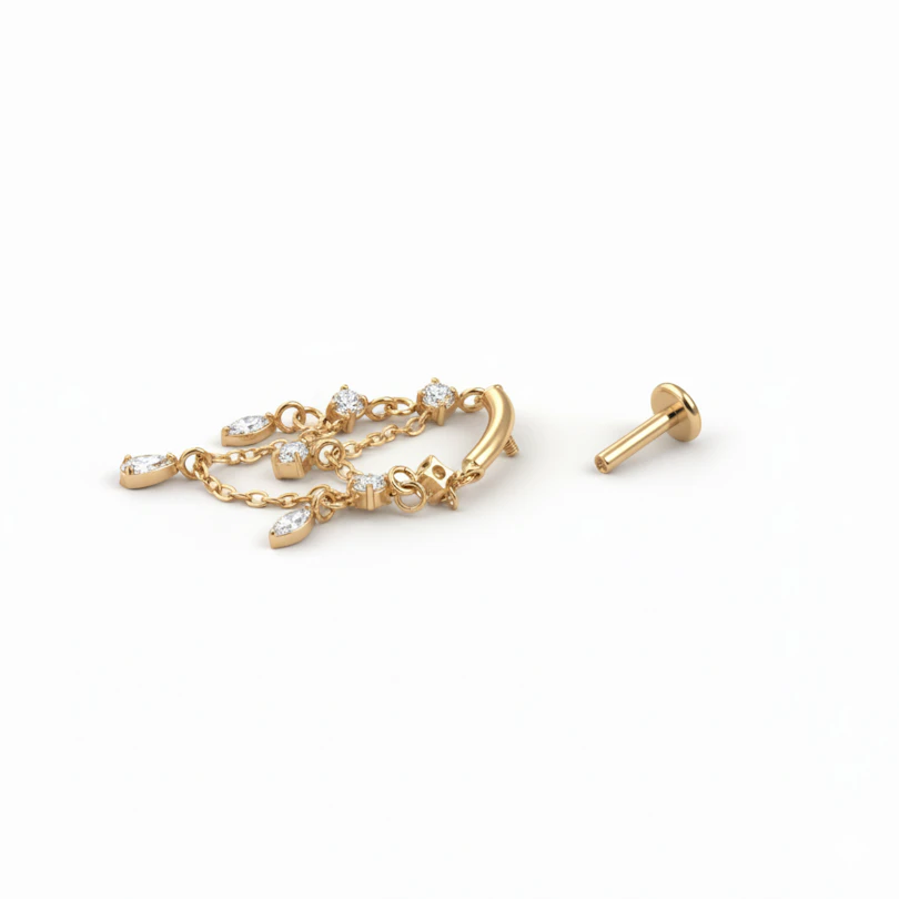 De titanium labret met chandelier-hangertjes draait helemaal om beweging. Kleine, met steentjes gezette druppeltjes hangen onder de labret en geven een subtiele beweging die je merkt als je je hoofd draait. Hij voelt chic zonder te overdrijven en werkt perfect als je iets wilt dat net even anders is dan je dagelijkse sieraden. Verkrijgbaar in goud- en zilverkleurig.