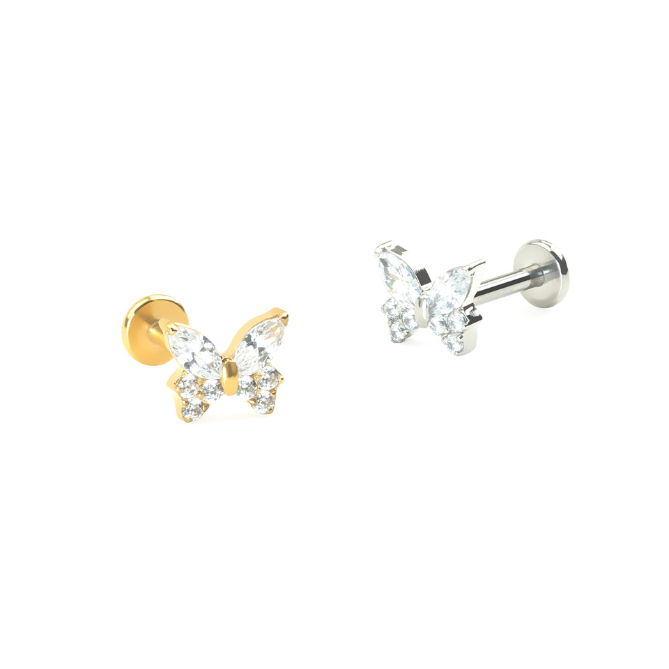 Deze mooie labret heeft 8 glinsterende CZ edelsteentjes - elke vleugel heeft een marquise snit steen, die de bovenkant van de vleugel vormt, en drie kleine ronde steentjes, die de onderkant van de vleugel vormen. Dit sieraad is net onder 7 mm op het wijdste punt en is 5,5 mm hoog, dus het is een ideale maat voor verschillende oor piercings.