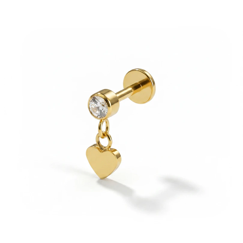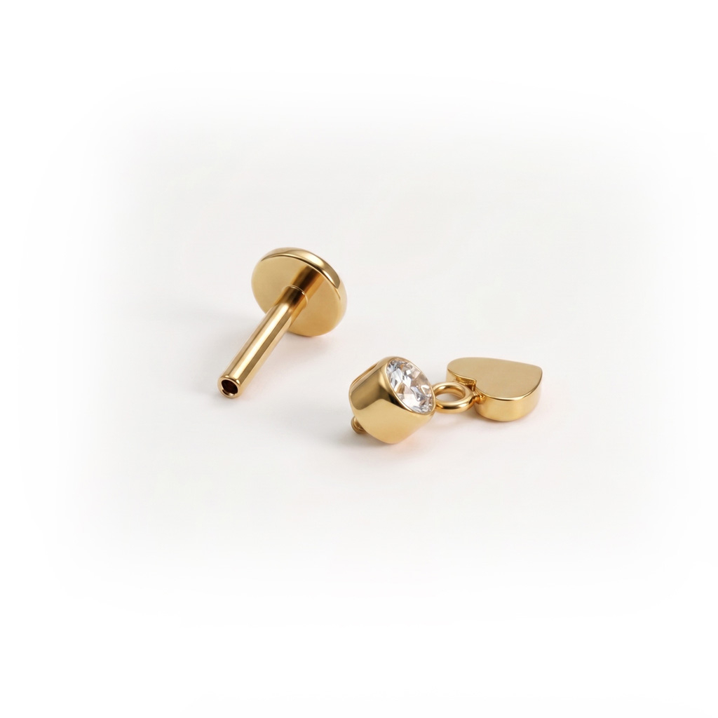 De titanium labret met hartbedeltje oogt op het eerste gezicht lekker simpel, maar voegt net dat ene detail toe dat de hele look ineens anders maakt. Een steen in bezelzetting zit bovenaan, terwijl daar net onder een hartvormig bedeltje hangt voor een subtiele beweging. Een sieraad dat je makkelijk solo stylet of combineert met andere piercingsieraden. Verkrijgbaar in goud- en zilverkleur.
