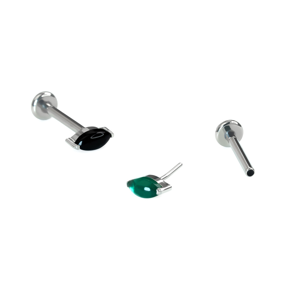 Deze titanium labret heeft een natuurlijke onyx steen met marquise snit, in het groen of zwart. De steen wordt op zijn plaats gehouden door elegante tandjes.