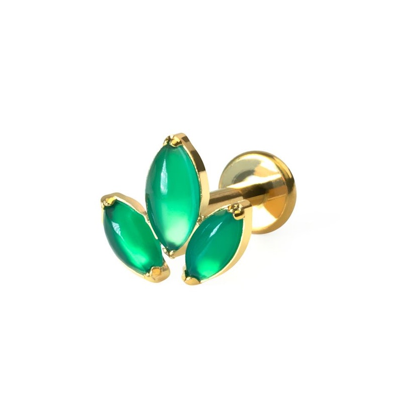Deze stijlvolle labret heeft 3 groene steentjes met marquise snit in een lotusbloem ontwerp.