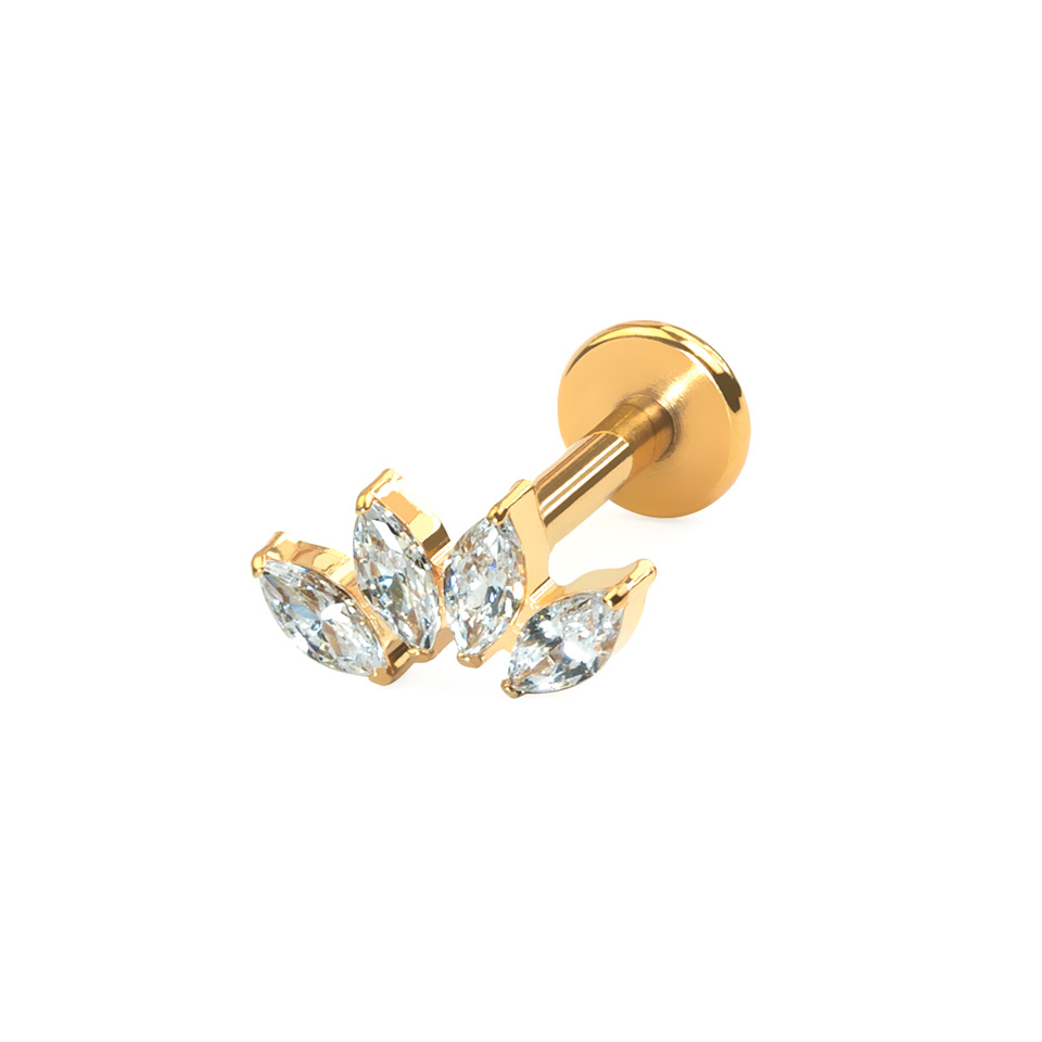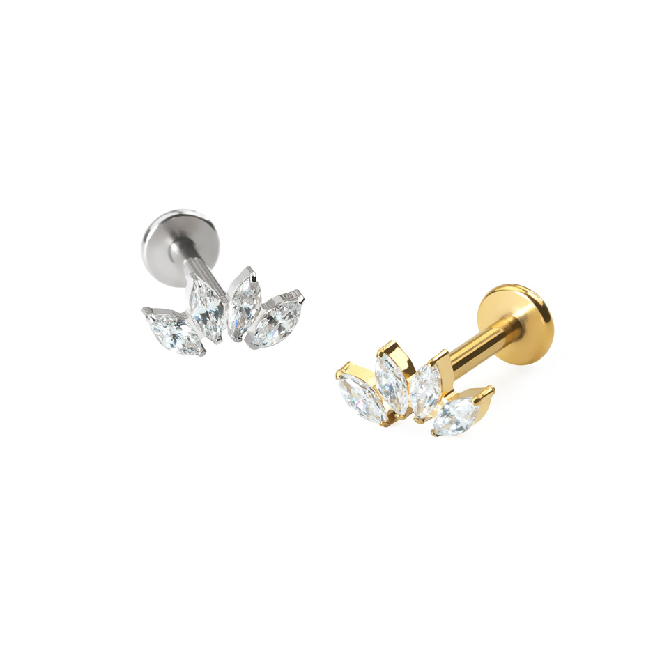 Deze elegante labret heeft 4 marquise snit CZ stenen in een boogje gezet. Geschikt voor verschillende oor piercings, zou het sieraad ideaal zijn voor een conch of flat piercing. Dit sieraad heeft een intern schroefdraad, wat betekent dat je simpelweg het gladde staafje inbrengt in je piercing en de bovenkant erop schroeft. Het is gemaakt van titanium, dus het zal comfortabel zijn om te dragen, zelfs voor de gevoelige huid.