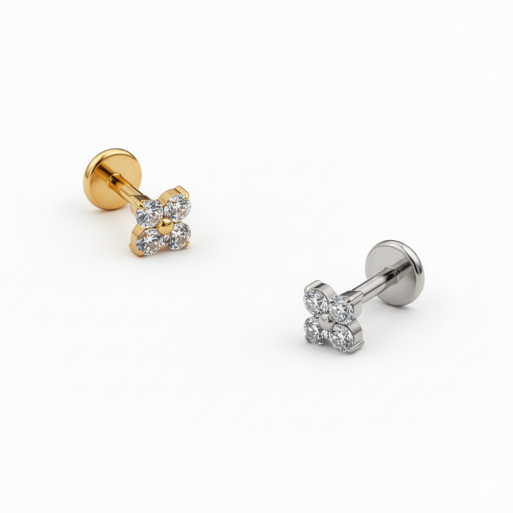 Gemaakt van titanium, dus hypoallergeen, waterbestendig en duurzaam voor dagelijks gebruik. De interne schroefdraad zorgt voor soepele plaatsing en een veilige pasvorm, zodat die precies blijft zitten waar die hoort. Afgewerkt met een platte achterkant voor comfortabel draaggemak, de hele dag door.