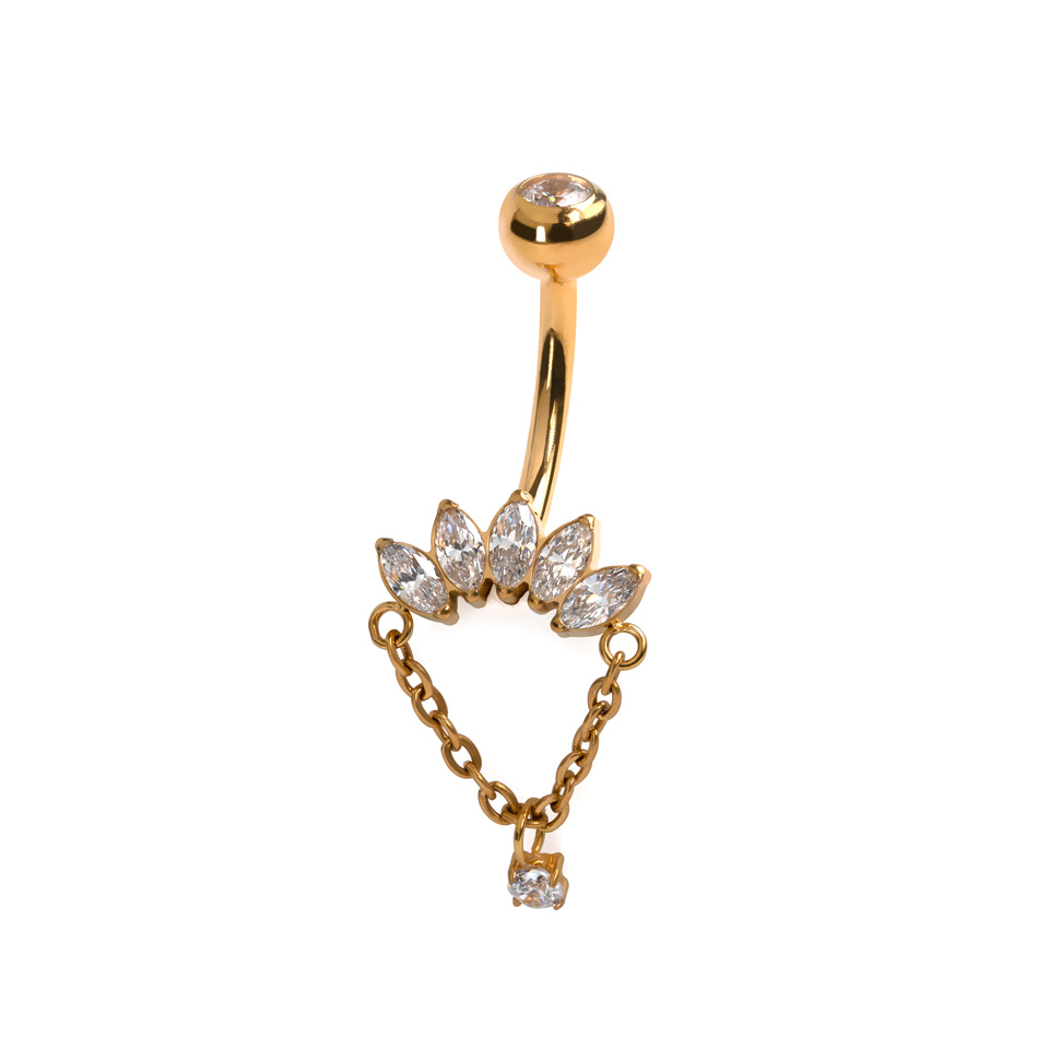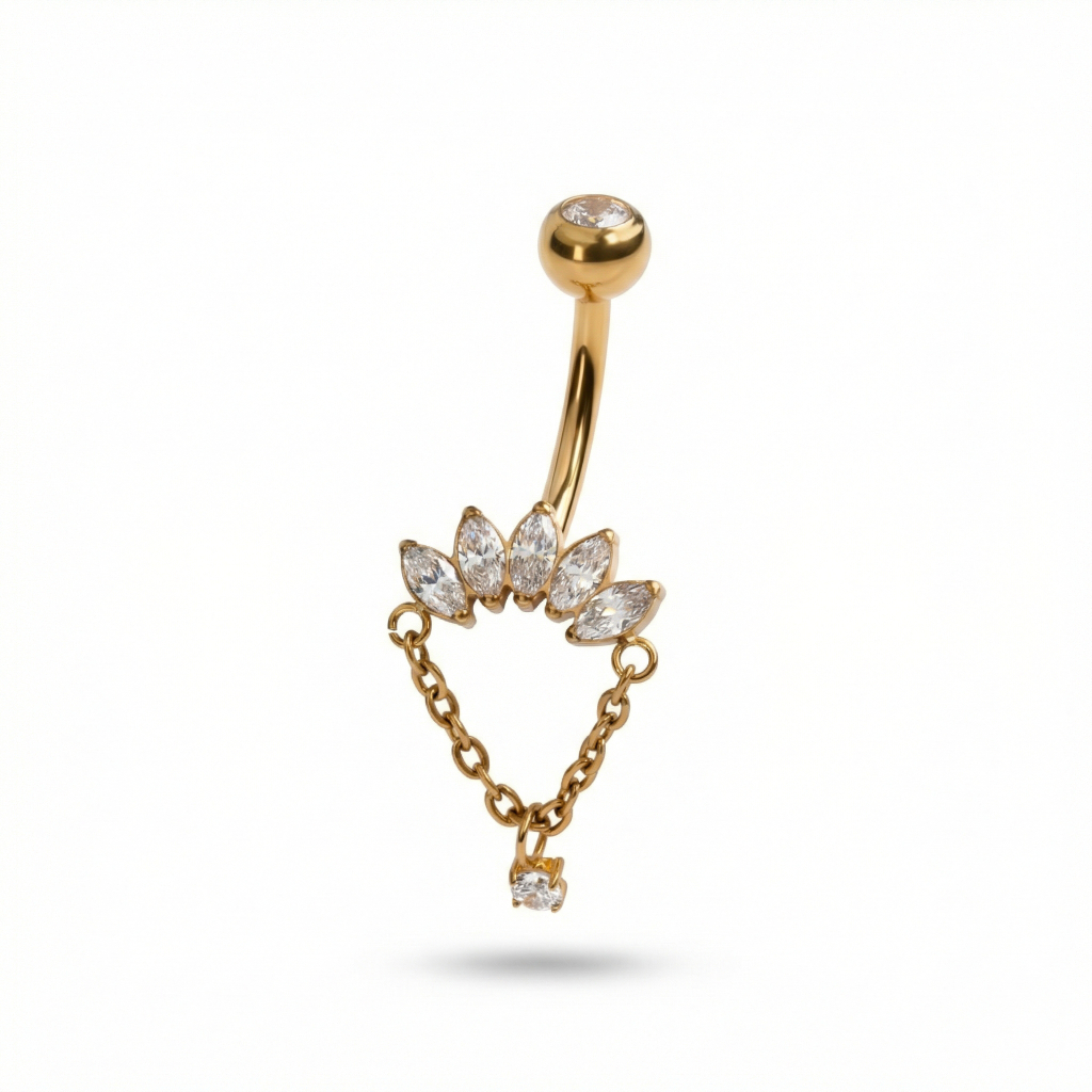 Deze titanium navel ring met marquise stenen en bedel aan ketting is niet zomaar een andere titanium barbell. Het is een sieraad met persoonlijkheid. De marquise snit stenen staan zoals een kroon, terwijl het bedeltje aan de ketting net genoeg drama toevoegt (omdat je piercing ook een publiek verdient).