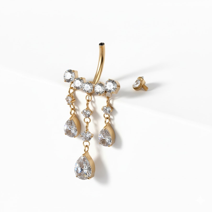 De titanium navelbarbell met hangende juwelen is gemaakt om op te vallen. Meerdere steentjes hangen in fijne druppels die met jou mee bewegen en het sieraad een onmiskenbare uitstraling geven. Het is gedetailleerd zonder druk te worden en gedurfd zonder zijn balans te verliezen. Verkrijgbaar in goud- en zilverkleur, draait deze navelbarbell helemaal om een extra aangeklede look.