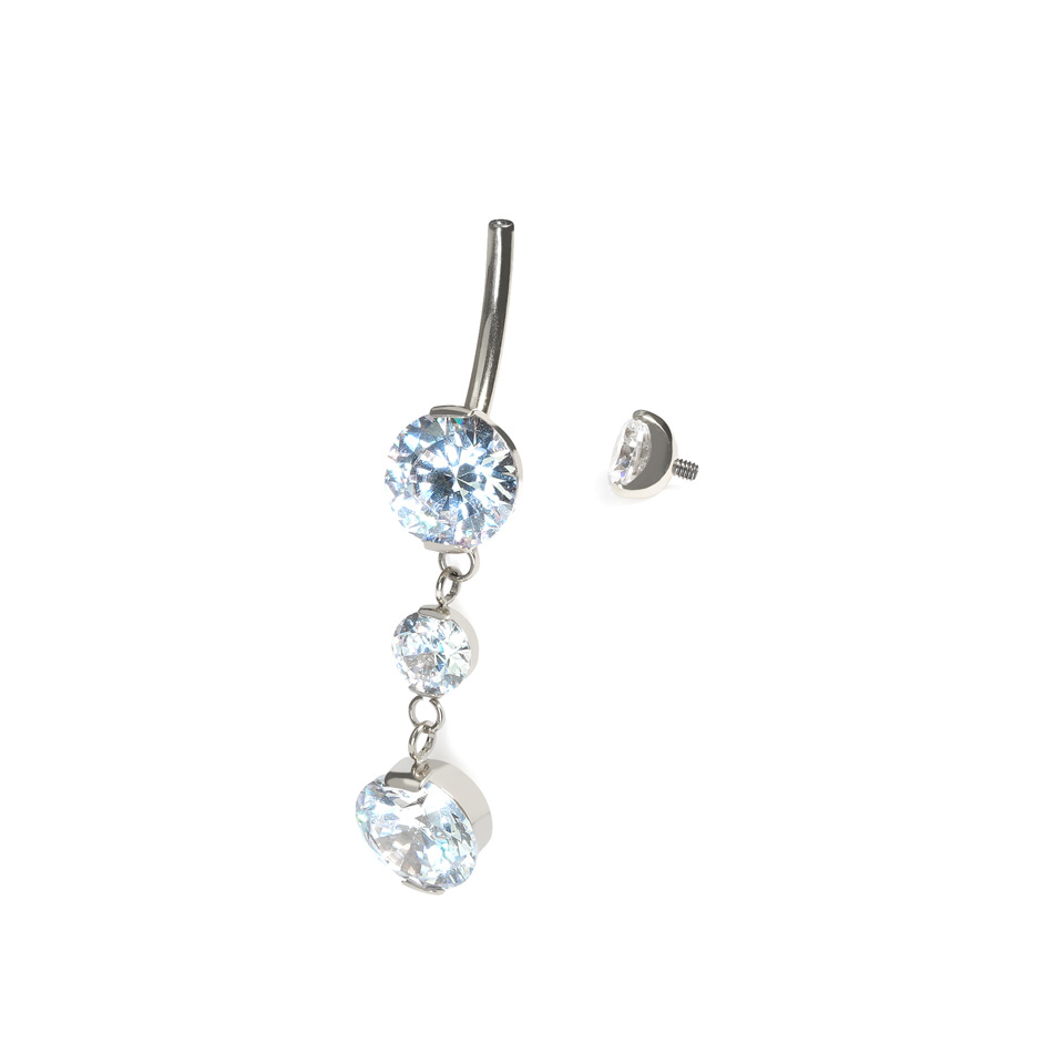 Deze prachtige navelring met bedel heeft 4 met tandjes gezette stenen, een in elk balletje en twee aan het bedeltje. De totale lengte van het onderste gedeelte - van de bovenkant van de onderste bal tot de onderkant van de bedel is net over 3cm. Dit sieraad heeft een intern schroefdraad, wat betekent dat enkel het gladde staafje door je piercing gaat, en de bovenkant erop geschroefd wordt om het vast te zetten. Titanium is hypoallergeen en waterproof, wat betekent dat dit sieraad perfect is voor dagen langs het zwembad.