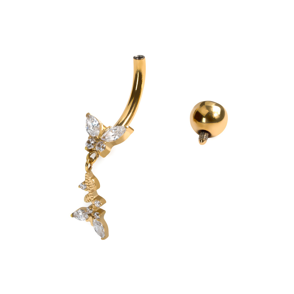 Deze prachtige titanium navelring met vlinders heeft een centrale vlinder met een hangertje met steentjes om een effect van vallende blaadjes te maken. Doordat het gemaakt is van titanium is het waterproof, en geschikt voor de gevoelige huid.