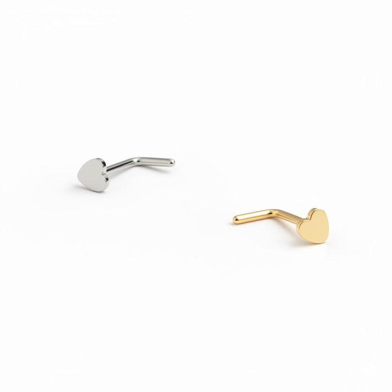 Ontworpen voor neusvleugelpiercings, zal deze hartvormige stud nooit onopgemerkt gaan. Beschikbaar in gouden en zilveren afwerkingen.