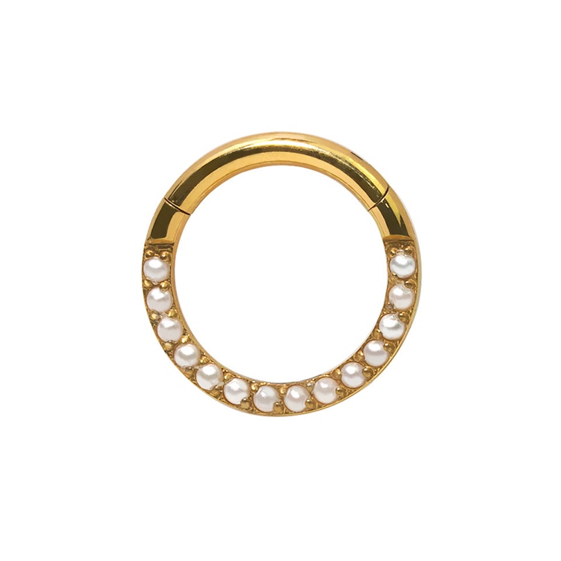 Deze titanium ring met scharnier is gezet met synthetische parels aan de voorkant, perfect om in piercings te dragen zoals je septum of daith.
