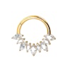 Deze mooie ring heeft 9 marquise snit CZ stenen in een patroon van afwisselend kleine en grote stenen. Dit sieraad is ideaal voor piercings waar je het ontwerp aan de voorkant van de ring wil in plaats van de zijkant, zoals een septum of daith. Het heeft een scharnier waardoor het makkelijk aan te brengen is in de piercing, en is gemaakt van titanium waardoor het geschikt is voor gevoelige huid.