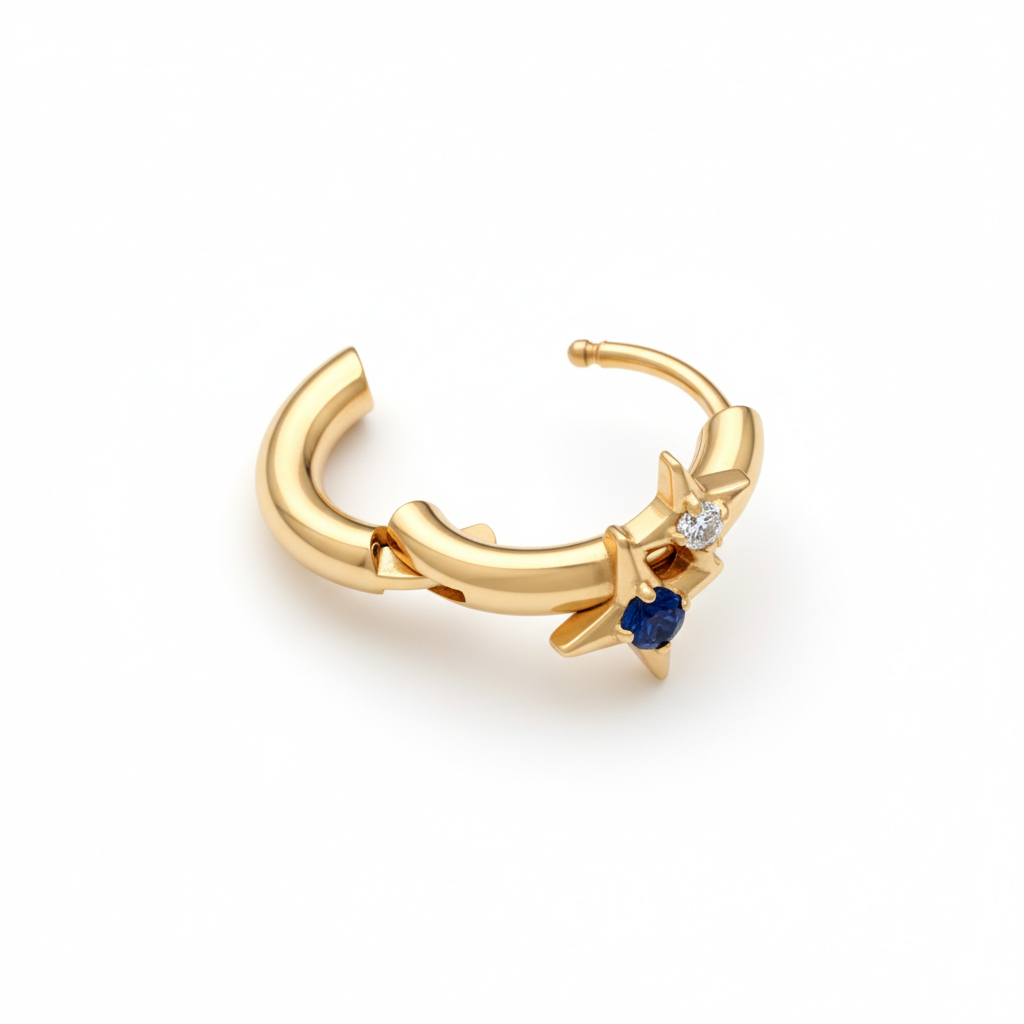 De titanium ring met twee sterren geeft een speelse twist aan een klassieke huggy-vorm. Twee kleine sterdetails staan naast elkaar, elk gezet met een gekleurde steen in een nette tandzetting, waardoor de ring nƩt genoeg karakter heeft zonder druk te worden. Verkrijgbaar in goud- en zilverkleurig, en makkelijk te mixen in een wat expressievere ear stack.