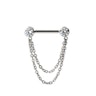 Deze tepel barbell is gemaakt van implantaatgraad titanium en heeft CZ steentjes in de balletjes. Dit unieke sieraad heeft ook 2 titanium kettingen die hangen onder de tepel. Ze zijn vastgemaakt aan de balletjes met een klein ringetje.