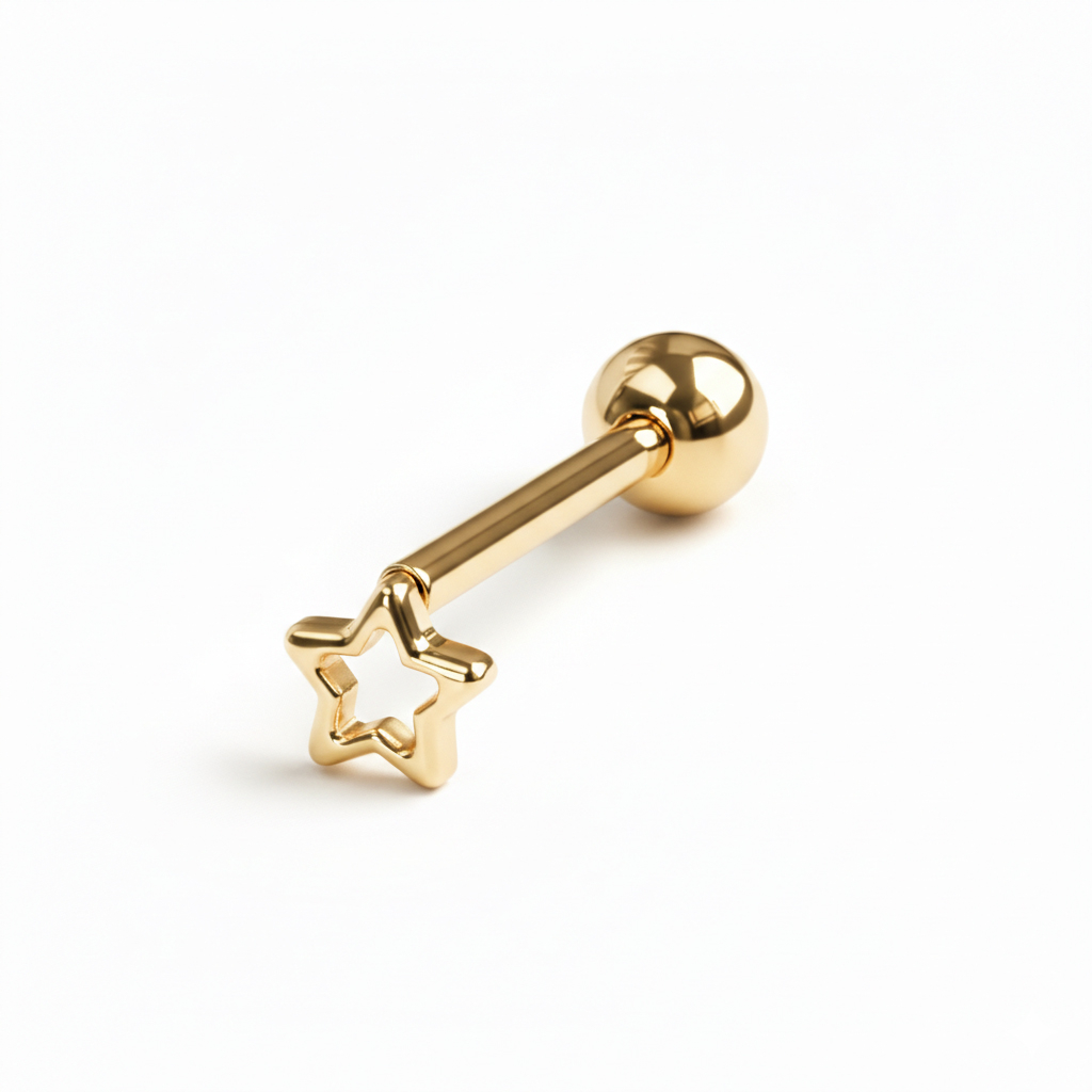Deze titanium tong barbell met ster is hypoallergeen, dus geschikt voor de gevoelige huid. Het heeft een intern schroefdraad, wat betekent dat je enkel het gladde staafje door je piercing doet, en de bovenkant erop draait.