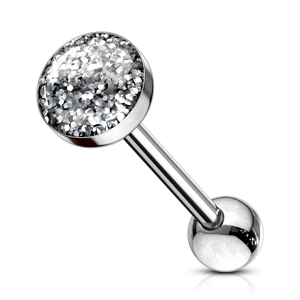 Er zijn zeven super mooie kleuren waaruit je kunt kiezen, en een deze bestaan uit een massa kleine glittertjes, die samengevoegd zijn onder een plastic koepeltje. Omdat het hier om glitters gaat, zal je tongpiercing glitteren en glanzen wanneer je je mond opent of aan het praten bent en het licht er op valt.