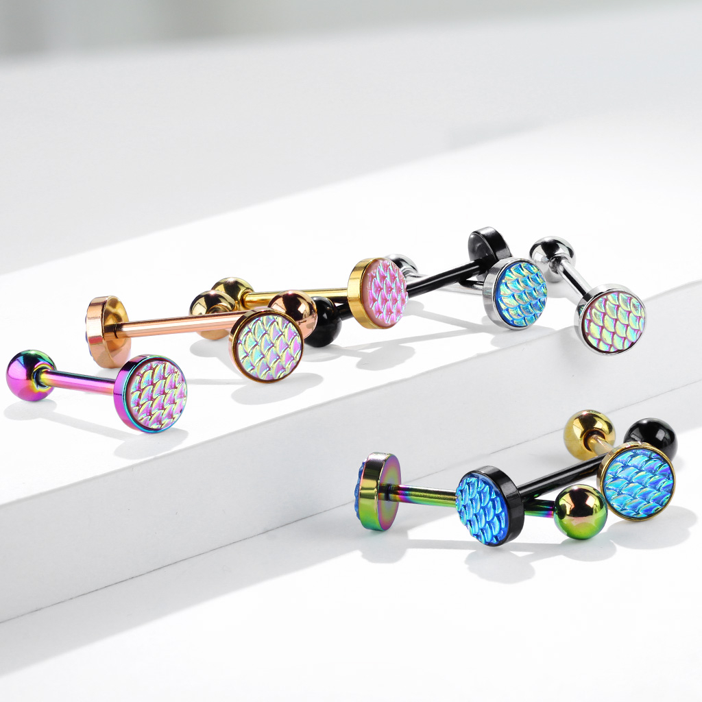 Op de afbeelding hierboven zie je een speciale tongpiercing. Deze tongpiercing heeft namelijk een zeemeermin-achtig schubbenpatroon in de top bal. Het patroon is gemaakt van hars en heeft verschillende kleuren nuancen in de hoofdkleur die jij zelf kiest. Dat betekent dat als jij voor de roze variant kiest, de kleuren op het sieraad dan ook veranderen afhankelijk van hoe het licht op het sieraad valt. Je kunt ook kiezen tussen verschillende kleuren voor de staaf, zodat je je geheel eigen kleurencombinatie kunt samen stellen voor jouw behoeften - iedere kleurencombinatie geeft het sieraad weer een andere look.