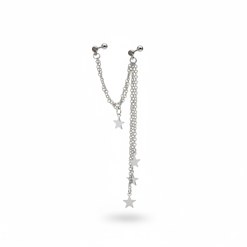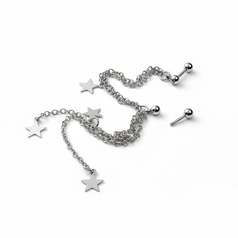 Heb jij twee oorgaatjes? Een helix- en een traguspiercing? Dan kun je hier nu zoete sterretjes en jouw piercing met elkaar verbinden, aangezien dit sieraad door sterretjes is versierd. De enige voorwaarde is natuurlijk dat je een tragus- en een helixpiercing in je oor hebt. Het sieraad bestaat namelijk uit twee kleine staafjes en een lange ketting, die beide staafjes dus verbindt.