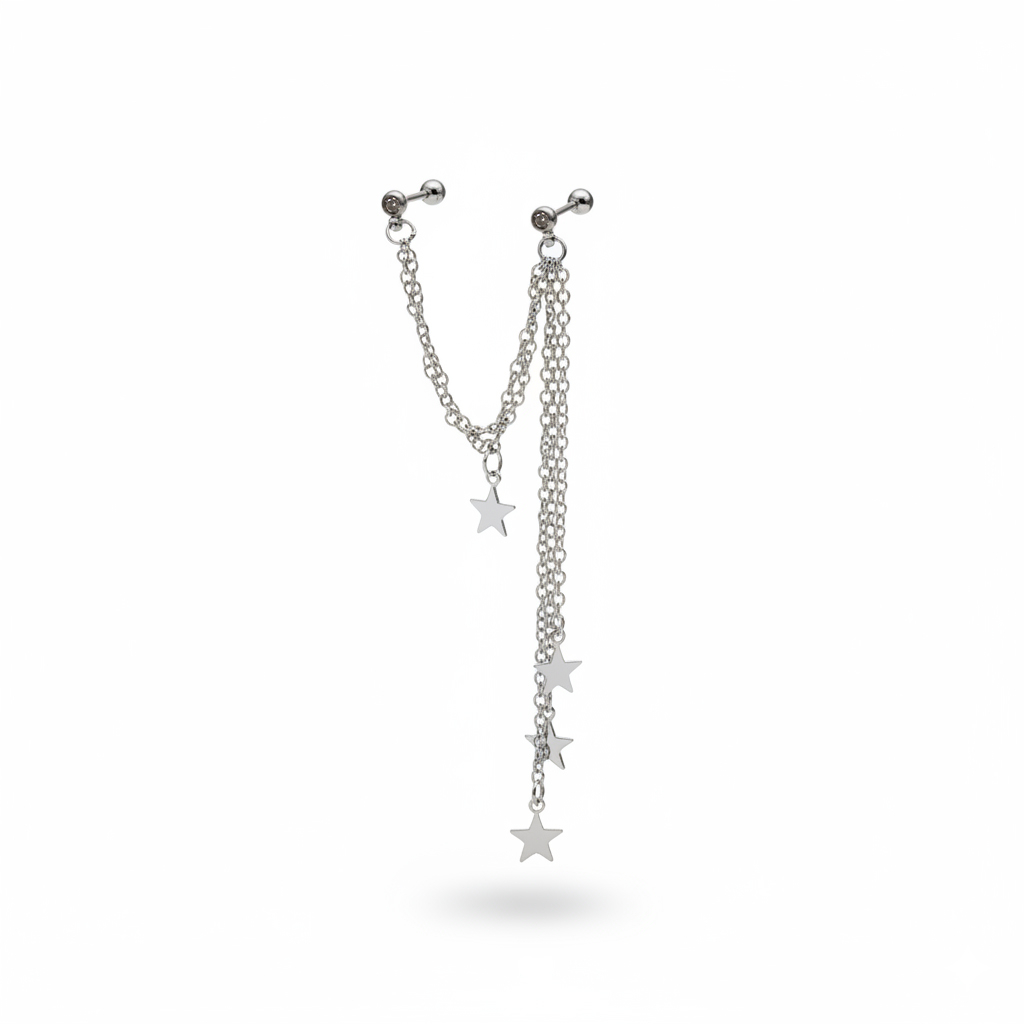 Heb jij twee oorgaatjes? Een helix- en een traguspiercing? Dan kun je hier nu zoete sterretjes en jouw piercing met elkaar verbinden, aangezien dit sieraad door sterretjes is versierd. De enige voorwaarde is natuurlijk dat je een tragus- en een helixpiercing in je oor hebt. Het sieraad bestaat namelijk uit twee kleine staafjes en een lange ketting, die beide staafjes dus verbindt.