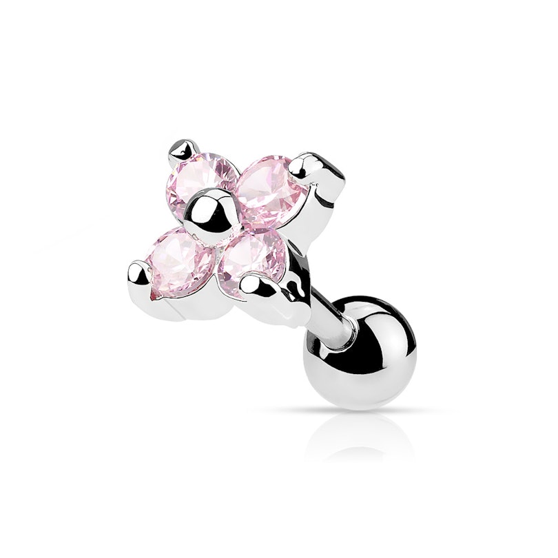 Hier vind je een kleine, schattige bloem als motief aan de voorkant van een piercingstaaf die je bijv. in een traguspiercing kan dragen. Het sieraad is 6 mm lang en 1,2 dik. De bloem meet van eind tot eind 8 mm, zodat je de bloem natuurlijk ook voor andere piercings kan gebruiken op voorwaarde dat de afmetingen overeen komen, bijv. in een helixpiercing of in de oorlellen. Elk bloemblaadje is versierd met een fonkelende steen waarvan je de kleur zelf kan kiezen.