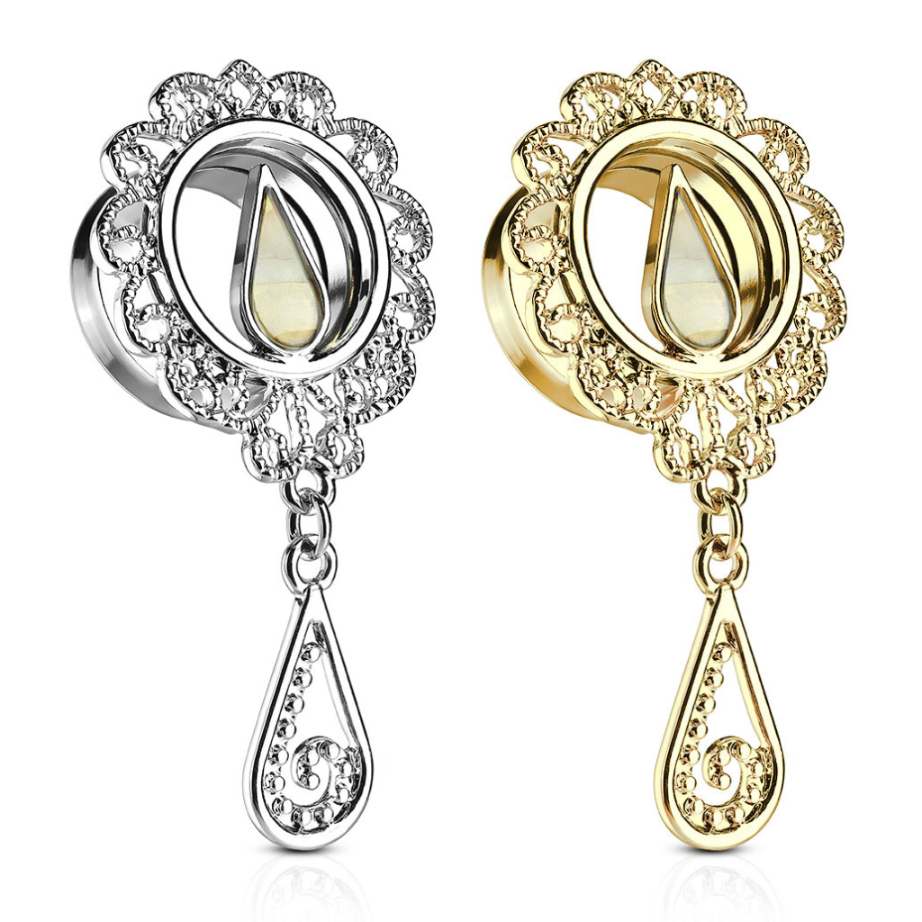 De tunnel die je hierboven ziet, is beschikbaar in twee edities. Een glanzend zilver en goudkleurig model. Ze zijn 100% identiek, behalve de kleur. Beide modellen zijn verkrijgbaar in zes maten, variërend van 6 - 16 mm. De druppel en het hele model veranderen evenredig met de grootte die je kiest voor het sieraad. Er zitten eigenlijk twee druppels op dit sieraad - een die vrij onder de tunnel hangt en een in de ring die vastzit in de tunnel, die ook een parelmoeren inleg heeft. Rond de tunnel zit een krans met eigenzinnige armen, die samen een filigraanpatroon vormen.