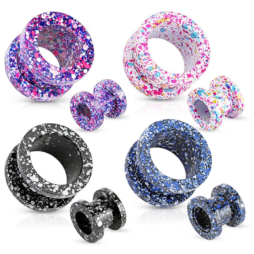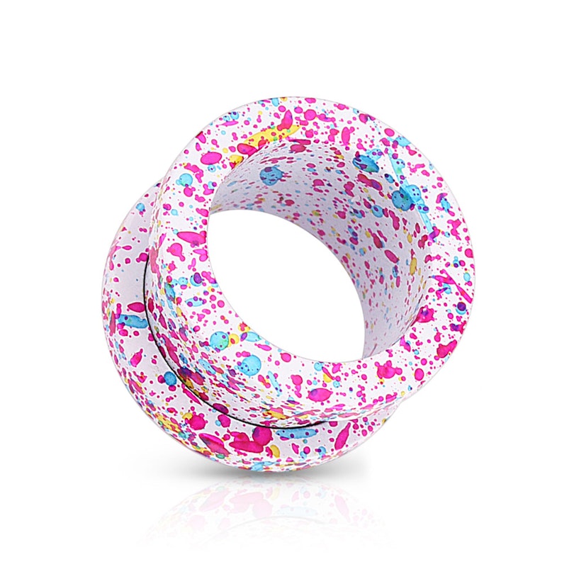 Hier hebben wij een super gave tunnel voor jou als je echt van houdt om kleuren en spikkels op je stretch sieraden te hebben. Deze vette tunnel is gemaakt van chirurgisch staal en is verkrijgbaar in verschillende groottes en kleuren, beginnend vanaf 3 mm in diameter tot en met 16 mm. Deze mooie tunnel is zo ontworpen dat hij er uit ziet alsof er met een penseel alle kleuren van een palet in 1 keer over het hele sieraad zijn gespetterd. De mooie vlekken zijn in kleuren die elkaar prachtig aanvullen en versterken.