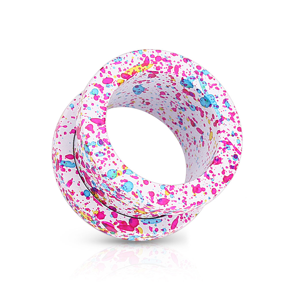 Hier hebben wij een super gave tunnel voor jou als je echt van houdt om kleuren en spikkels op je stretch sieraden te hebben. Deze vette tunnel is gemaakt van chirurgisch staal en is verkrijgbaar in verschillende groottes en kleuren, beginnend vanaf 3 mm in diameter tot en met 16 mm. Deze mooie tunnel is zo ontworpen dat hij er uit ziet alsof er met een penseel alle kleuren van een palet in 1 keer over het hele sieraad zijn gespetterd. De mooie vlekken zijn in kleuren die elkaar prachtig aanvullen en versterken.