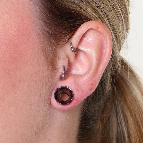 Deze tunnel is uit prachtig rozenhout vervaardigd en in ''Double Flat Flare'' ontworpen, wat betekent dat het sieraad twee hoge kanten en een kleinere binnenkant heeft, die in de oorlel zit.