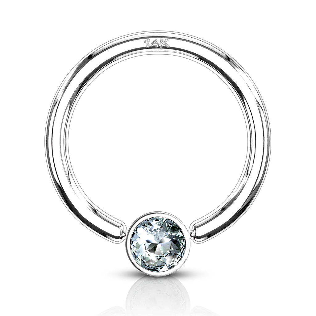 Een mooie ball closure ring uit puur 14 karaats goud met een vonkelende, transparante steen die bijna de hele bal vult. Deze ring is niet alleen maar een kwaliteitsproduct vanwege het materiaalsoort, maar ook vanwege het vrouwelijk en tijdloze ontwerp. De ring heeft een staafsterkte van 1,2 mm en 8 mm in diameter, en is dan ook geschikt voor verschillende piercings op verschillende plekken in het lichaam. Het is voornamelijk het feit dat de maat van veel piercings en de maat van het sieraad overeenstemmen, waardoor dit een universeel sieraad te noemen is. Het balletje dat bij dit sieraad hoort meet 3 mm.