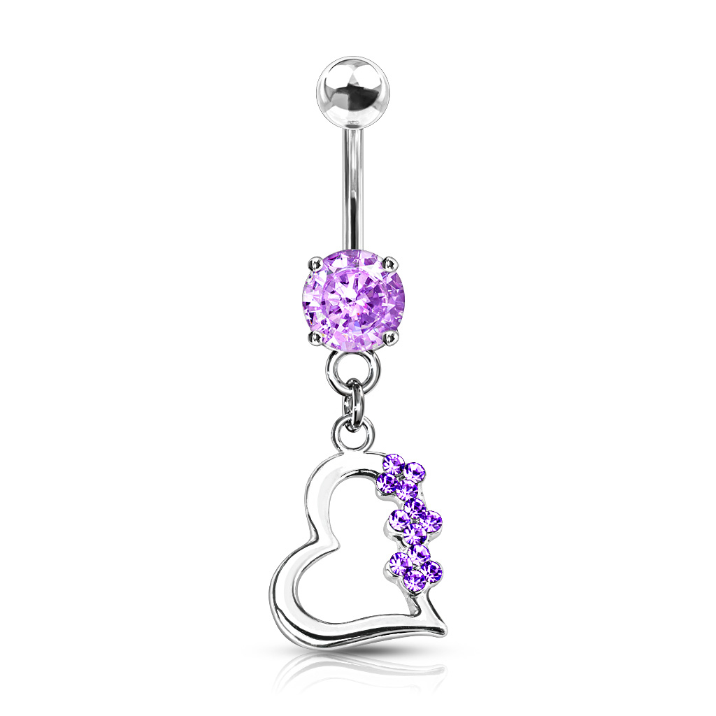 Prachtig bewerkte navelpiercing met een indrukwekkend ontwerp van een grote, vonkelende steen met kleinere steentjes in de hartvormige hanger. Het sieraad is in drie verschillende kleuren verkrijgbaar en het enige wat je dan nog hoeft te doen is je favoriete kleur uit te kiezen.