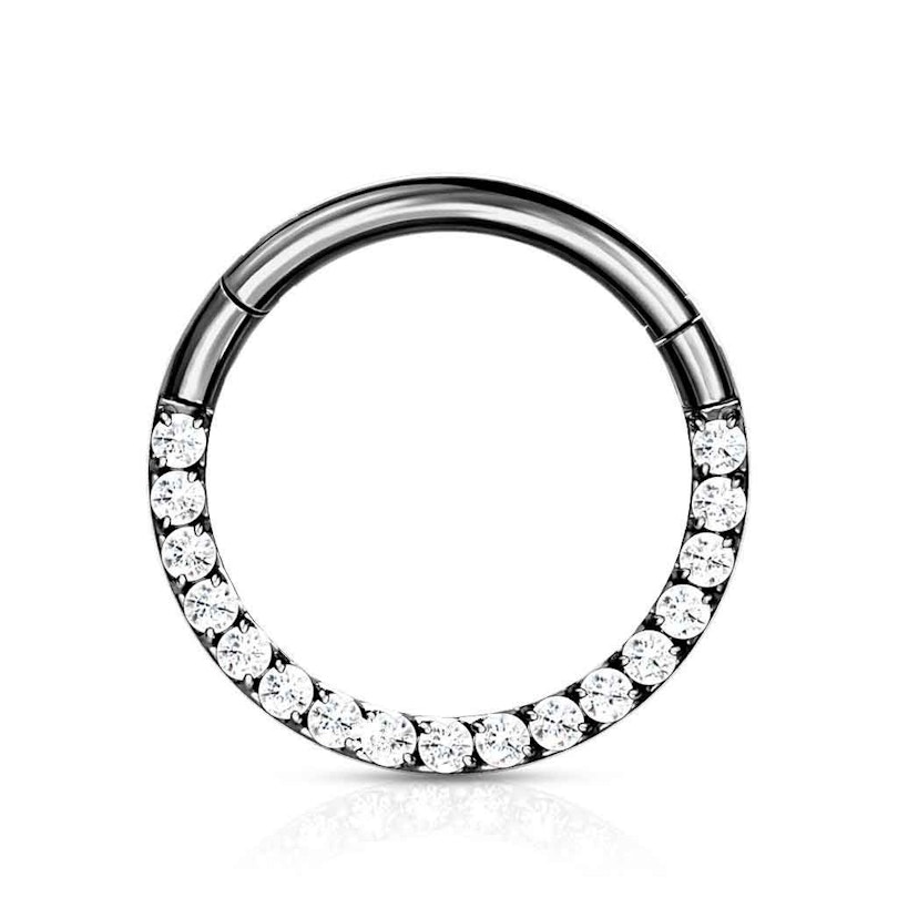 Het voorste deel van de ring heeft een rij fonkelende steentjes. Houd rekening met de plek van de steentjes als je kiest in welke piercing je deze ring wilt. De steentjes zijn bijvoorbeeld ideaal voor een septum en daith piercing, maar voor een neusgat piercing geef je misschien toch liever de voorkeur aan een ontwerp met steentjes die naar buiten zijn gericht.