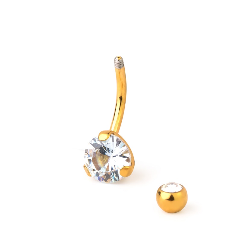 Vergulde navelpiercings met stenen zijn niets nieuws en toch is dit model ietwat anders dan de typische modellen, want de steen is niet aan het balletje vastgelijmd. Een elegante en solide verankering zorgt ervoor dat de steen niet uit het sieraad kan vallen en doet de steen nog groter lijken dan dat deze feitelijk is.