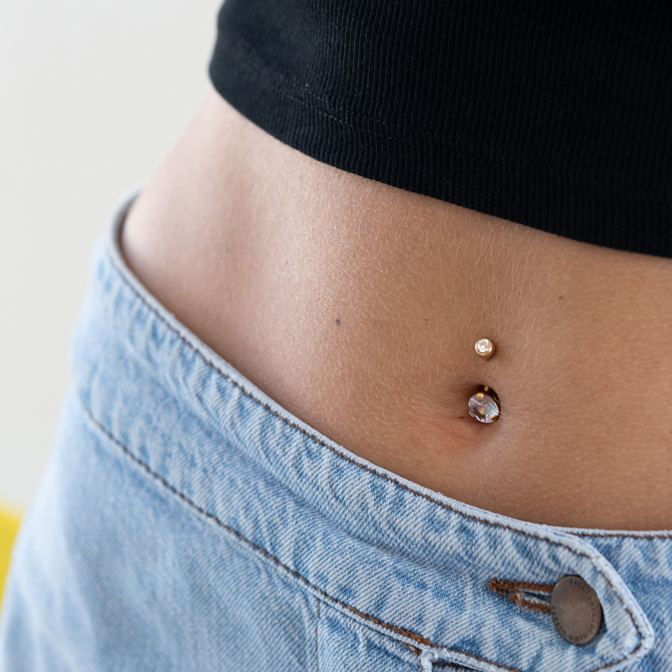 Vergulde navelpiercings met stenen zijn niets nieuws en toch is dit model ietwat anders dan de typische modellen, want de steen is niet aan het balletje vastgelijmd. Een elegante en solide verankering zorgt ervoor dat de steen niet uit het sieraad kan vallen en doet de steen nog groter lijken dan dat deze feitelijk is.