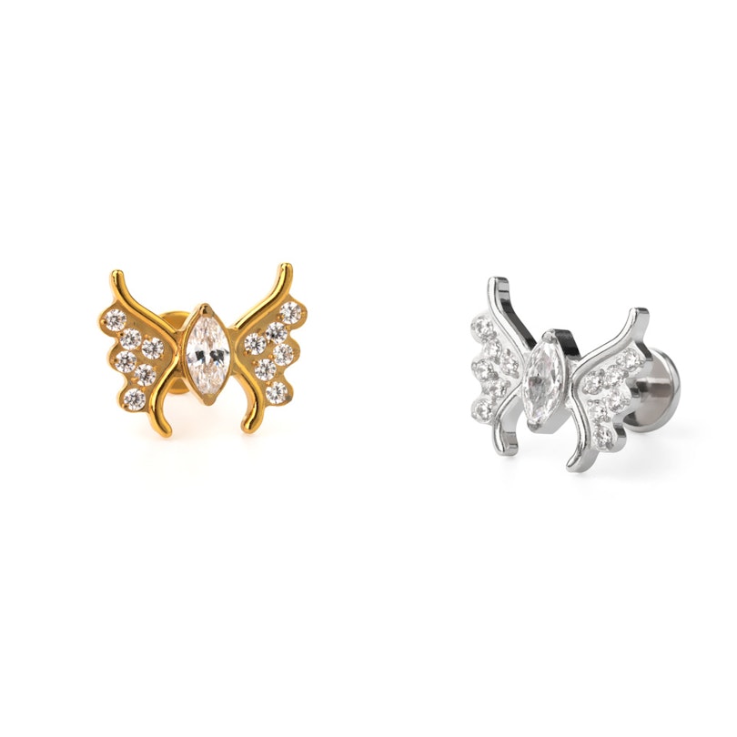 Deze prachtig gedetailleerde labret heeft de vorm van een mooie vlinder. Het lichaam bestaat uit een ovaalvormige CZ steen en de delicate vleugels zijn bezaaid met 6 kleine steentjes. Dit sieraad is gemaakt van titanium en is duurzaam en hypoallergeen, en dankzij de interne schroefdraad is het heel gemakkelijk en comfortabel om in je piercing te dragen. Deze vlinder zal een charmante toevoeging aan je oor zijn.