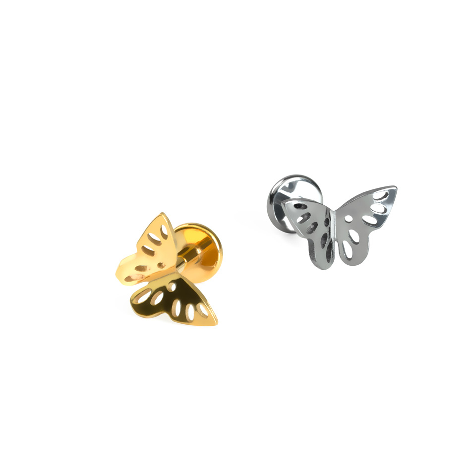 Deze prachtige labret heeft een gedetailleerde vlinder die eruit ziet alsof hij elk moment kan wegvliegen.
