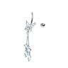 Deze glinsterende navel ring heeft een prachtige vlinder op de onderste bal, met meer glinsterende steentjes in het hangertje wat onderaan de vlinder hangt, vastgemaakt met elegante kettinkjes.