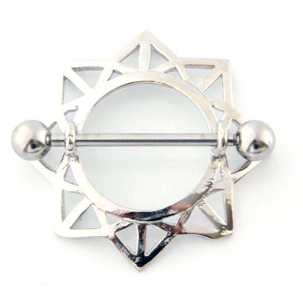Deze mooie tepelpiercing is gemaakt van chirurgisch staal en is gevormd naar een kruising tussen een bloem en een zon.