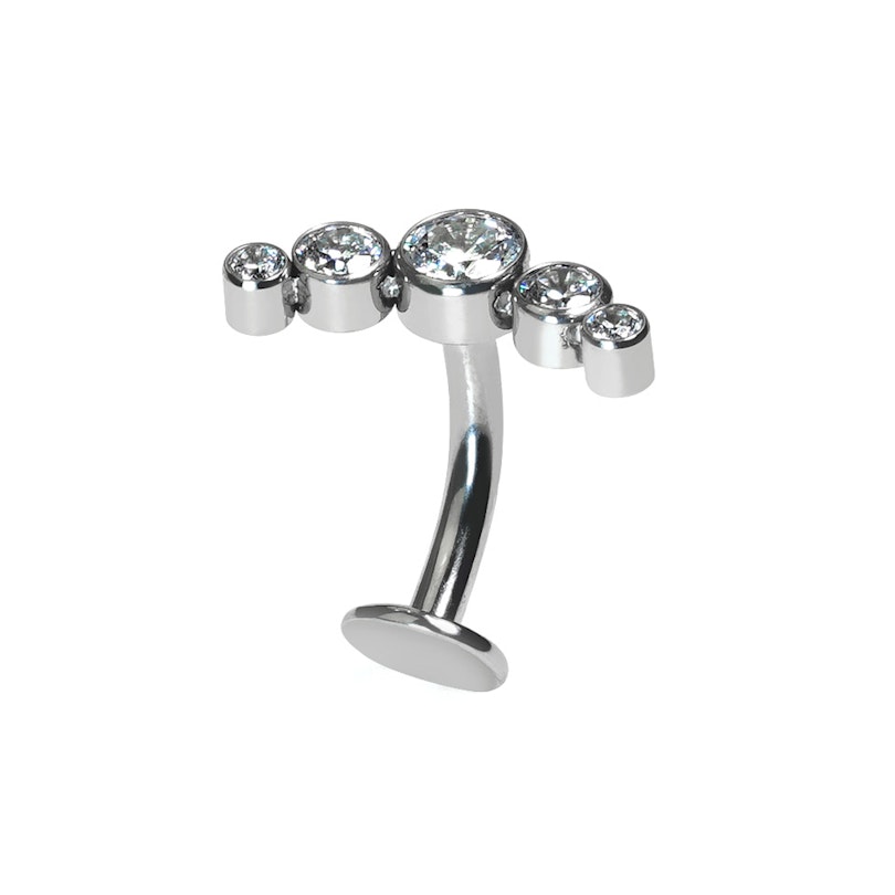 Deze zwevende titanium navel ring heeft vijf prachtige bezel gezette kristallen. Doordat het gemaakt is van titanium, is het hypoallergeen en waterproof. Dit sieraad heeft een push-in mechanisme, wat betekent dat je enkel het pinnetje een beetje hoeft te buigen en het in het staafje moet doen om het vast te zetten.